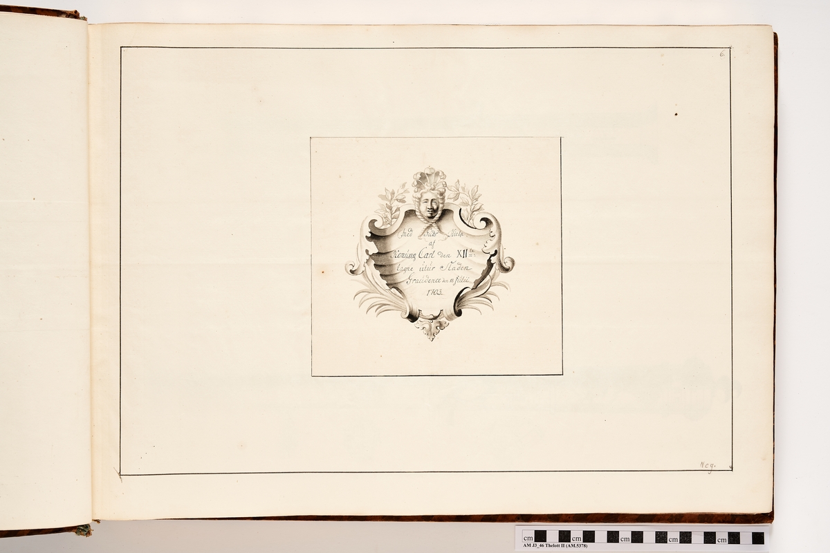 Kartusch till bokverk med avbildningar föreställande eldrör tagna som troféer av den svenska armén åren 1703-1706, utförda av syskonen Anna Maria och Philip Jakob Thelott. Avser troféer tagna utur staden Graudenz den 18 juli 1703.