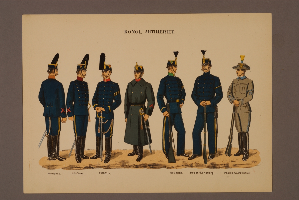 Plansch i färgtryck med uniform för Artilleriet. Ingår i planschsamlingen Svenska krigsmaktens fordna och nuvarande munderingar utgiven av P.B Eklund 1900-1905.