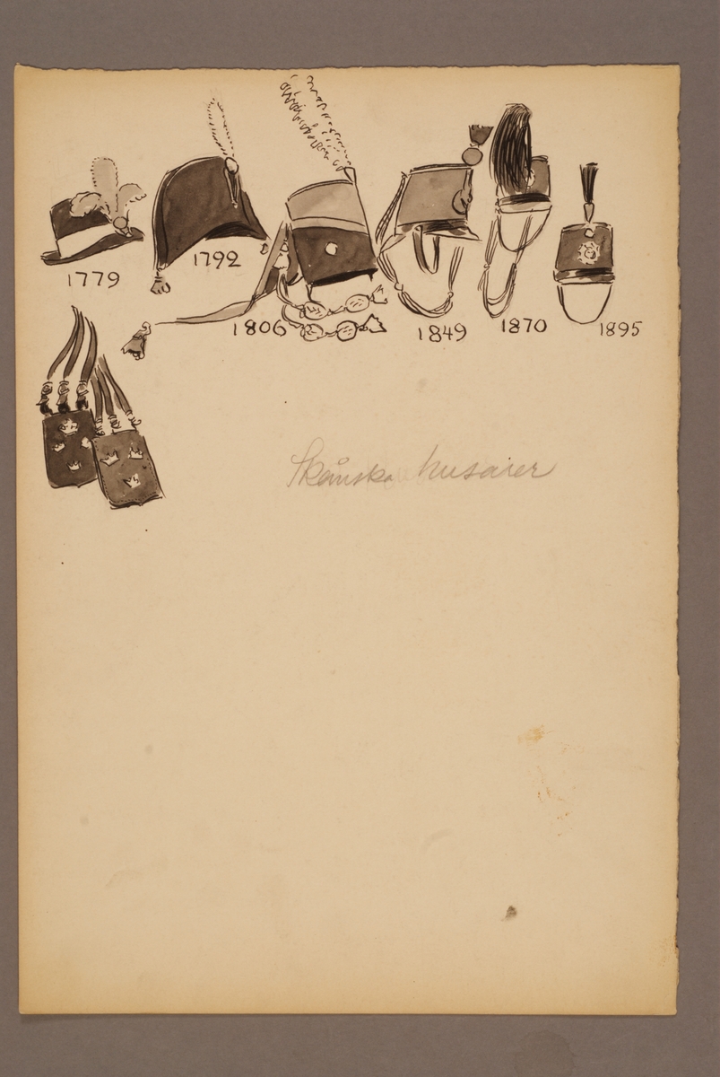 Plansch med huvudbonader för Skånska husarregemente för åren 1748-1807, ritad av Einar von Strokirch.