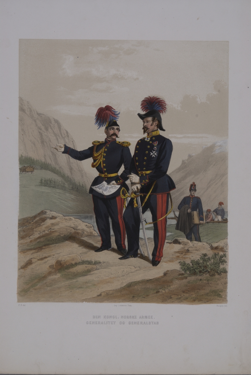 Plansch med uniform för Norska armén, Generalitetet och Generalstaben. Plansch i färgtryck efter original av Fritz von Dardel. Ingår i planschsamlingen Den svenska och norske armeens uniformer, 1861-1863.