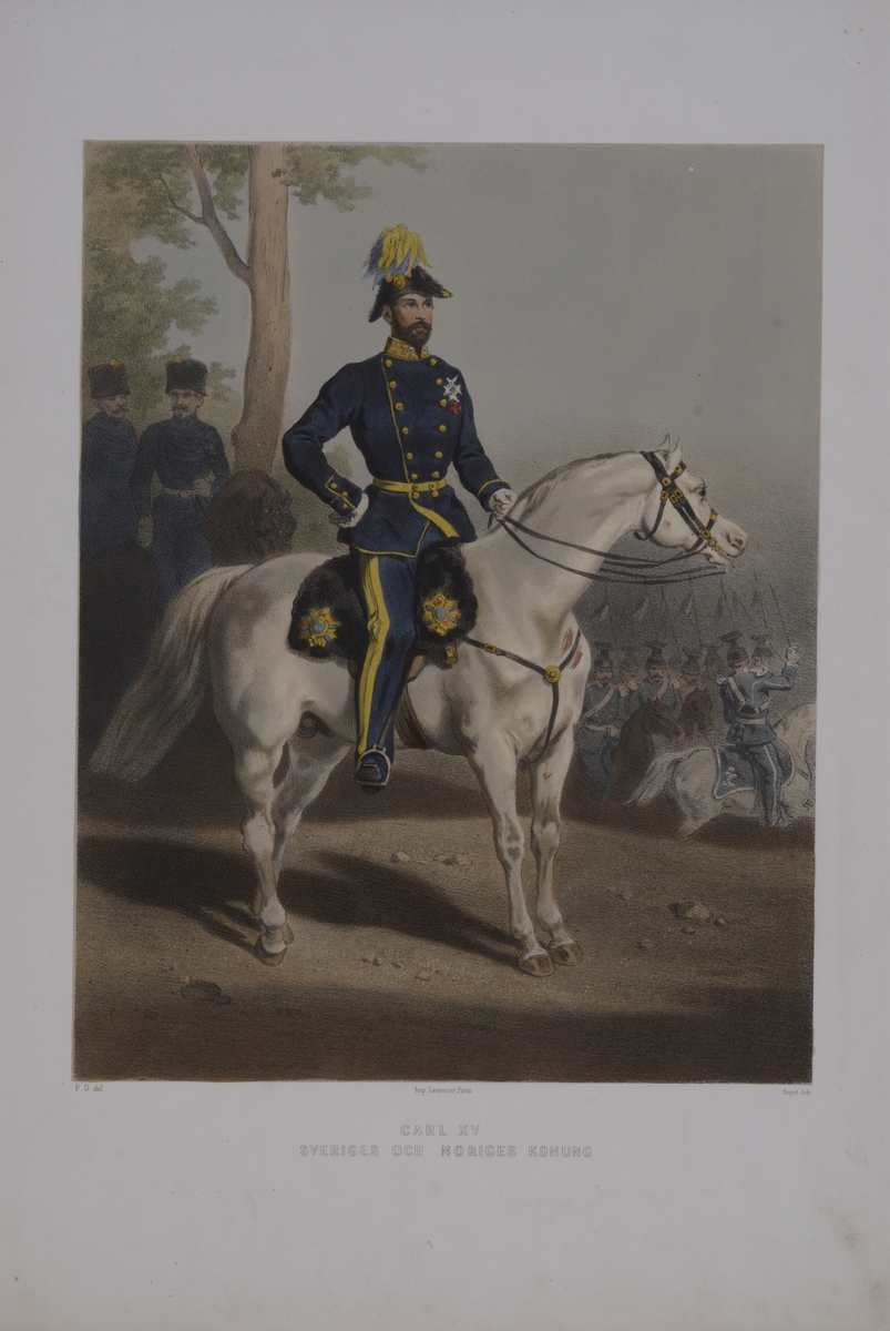Plansch med uniform för Carl XV Sveriges och Norges kung. Plansch i färgtryck efter original av Fritz von Dardel. Ingår i planschsamlingen Den svenska och norske armeens uniformer, 1861-1863.