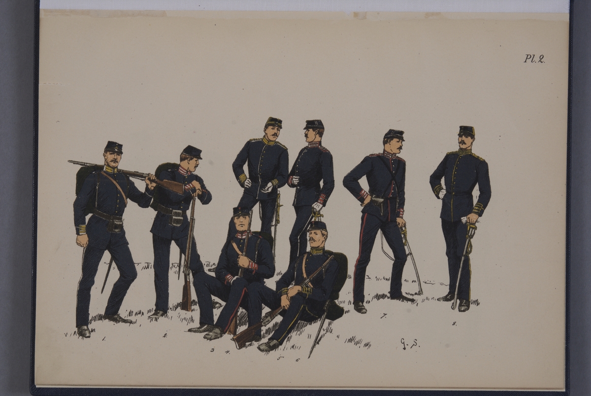 Plansch med uniform för Livregementets grenadjärkår, Första livgrenadjärregementet, Andra livgrenadjärregementet och Smålands grenadjärkår. Ingår i planschsamlingen Svenska armén - 7 planscher i färgtryck, utgiven av Otto Holmgren.