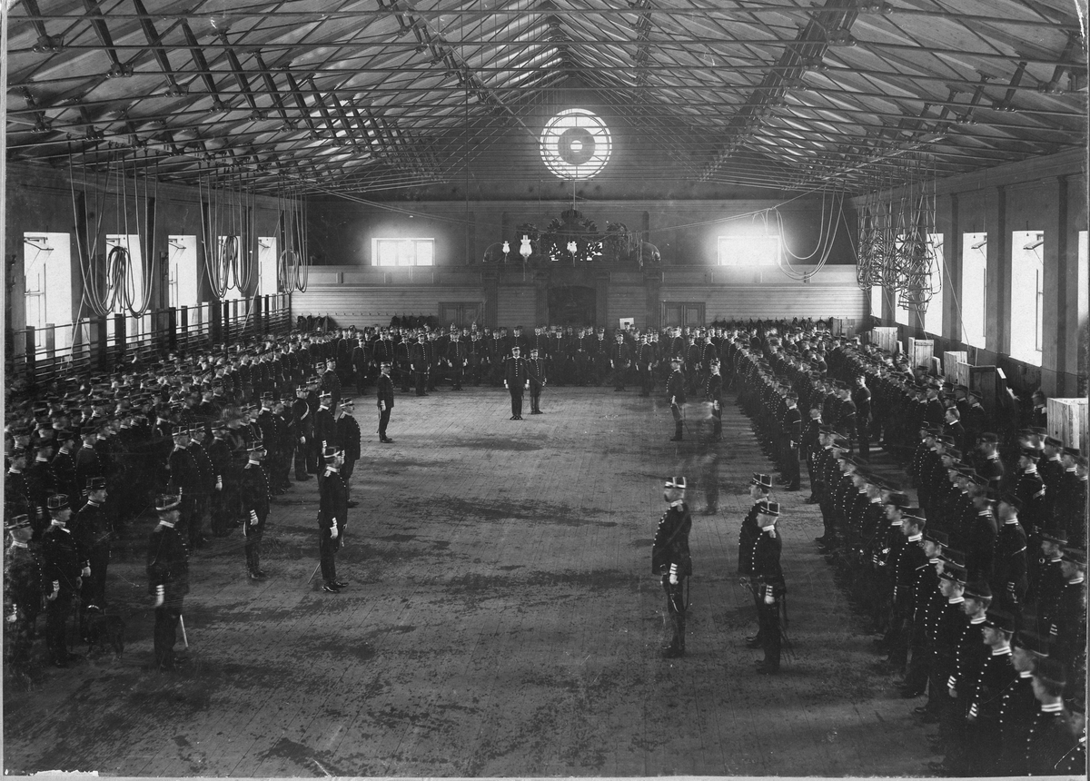 Göta livgardes, I 2, avlämning i april 1896. Den avgående sekundchefen generalmajor J. Z. Rudbeck avtackar och den pågående överste P.C.L. Lovén avlämnar regementet i dess gymnastiksal.