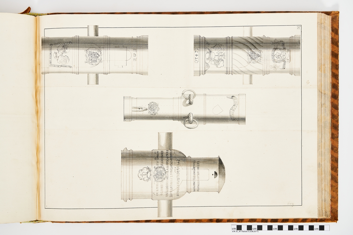 Avbildning föreställande eldrör tagna som troféer av den svenska armén med fästningen Kokenhusen 11 juli 1701. Ingår i volym med avbildade kanontroféer tagna åren 1700-1702.