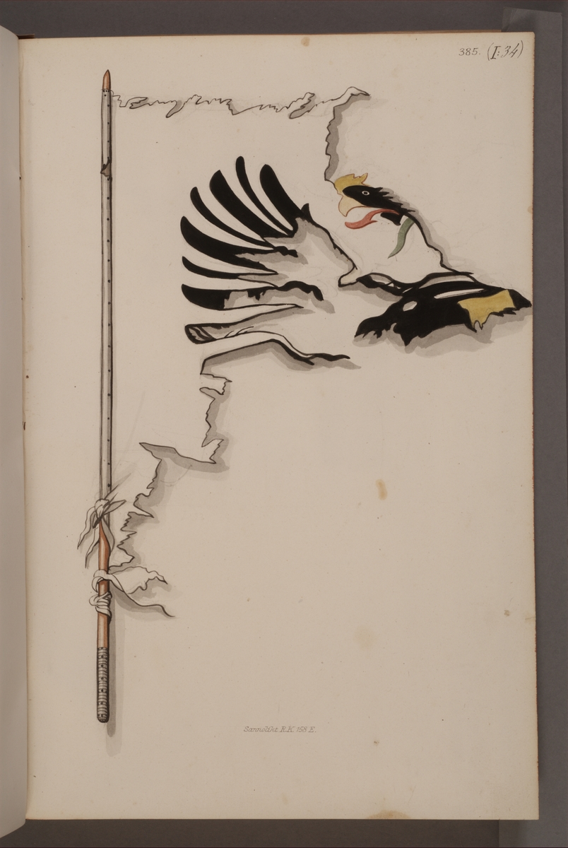 Titel: Avbildning i gouache föreställande fana tagen som trofé av svenska armén. Den avbildade fanan finns delvis bevarad i Armémuseums samling, för mer information, se relaterade objekt.