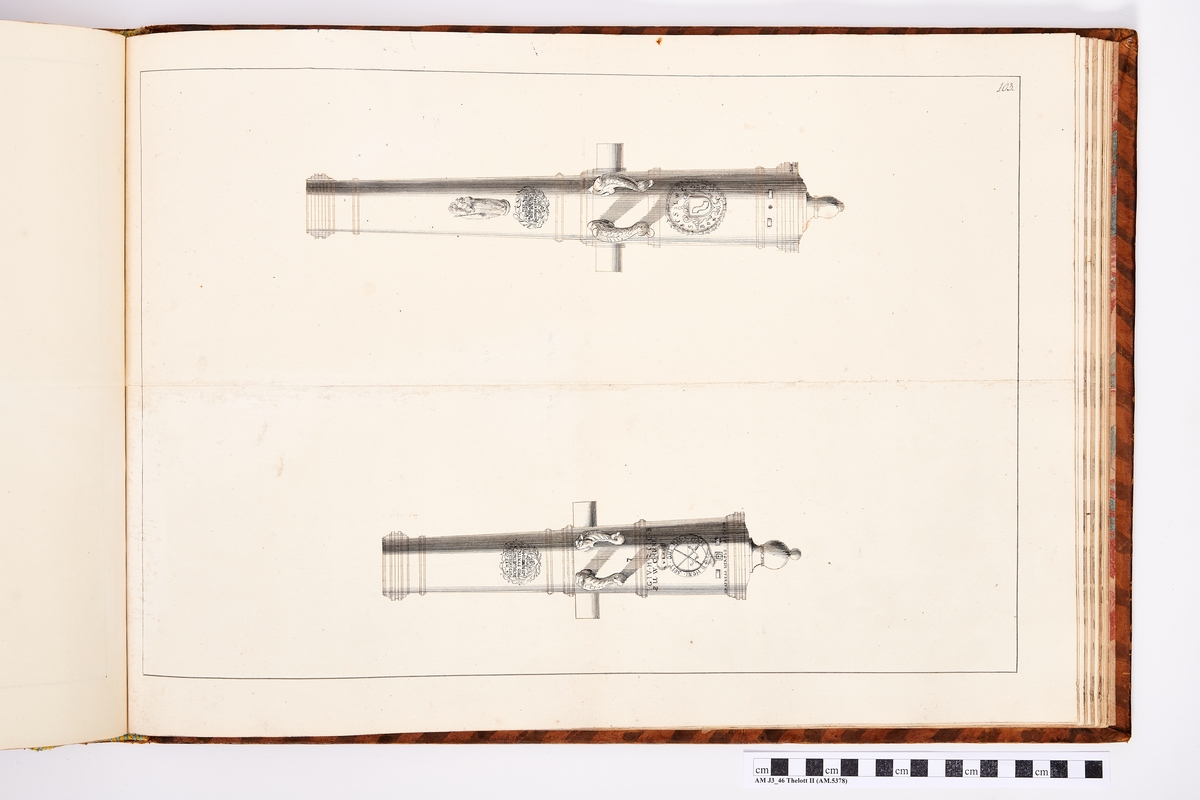 Avbildning föreställande eldrör tagna som troféer av den svenska armén vid Punit den 28 november 1704. Ingår i volym med avbildade kanontroféer tagna åren 1703-1706.