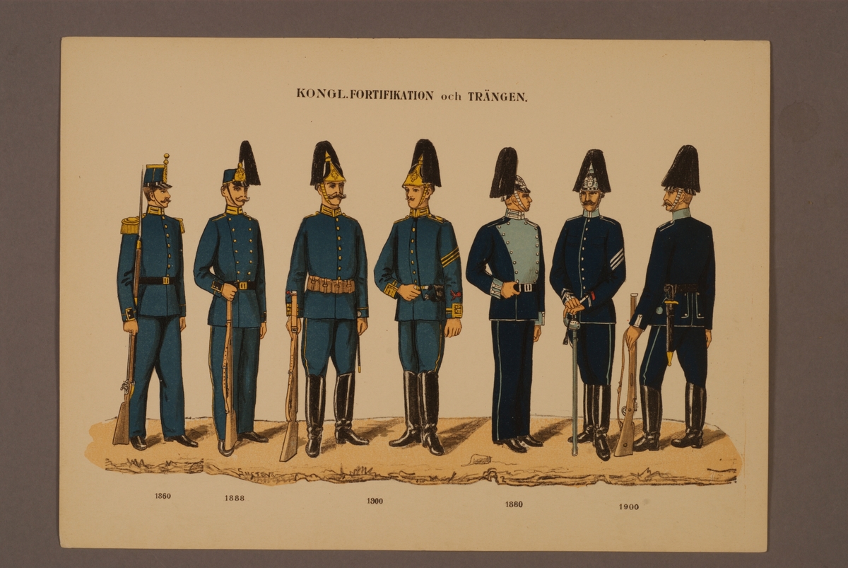 Plansch i färgtryck med uniform för Fortifikationen och Trängen för åren 1860-1900. Ingår i planschsamlingen Svenska krigsmaktens fordna och nuvarande munderingar utgiven av P.B Eklund 1900-1905.