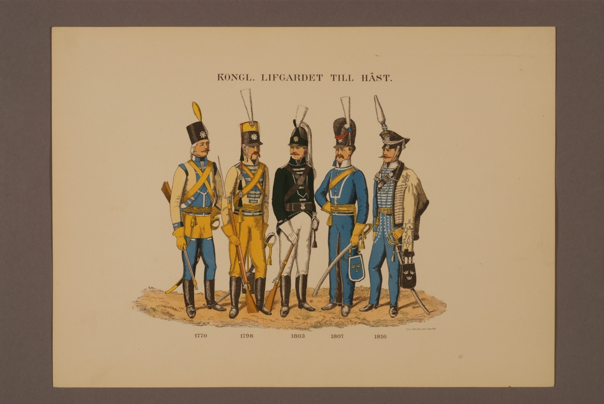 Plansch i färgtryck med uniform för Livgardet till häst för åren 1770-1816. Ingår i planschsamlingen Svenska krigsmaktens fordna och nuvarande munderingar utgiven av P.B Eklund 1900-1905.