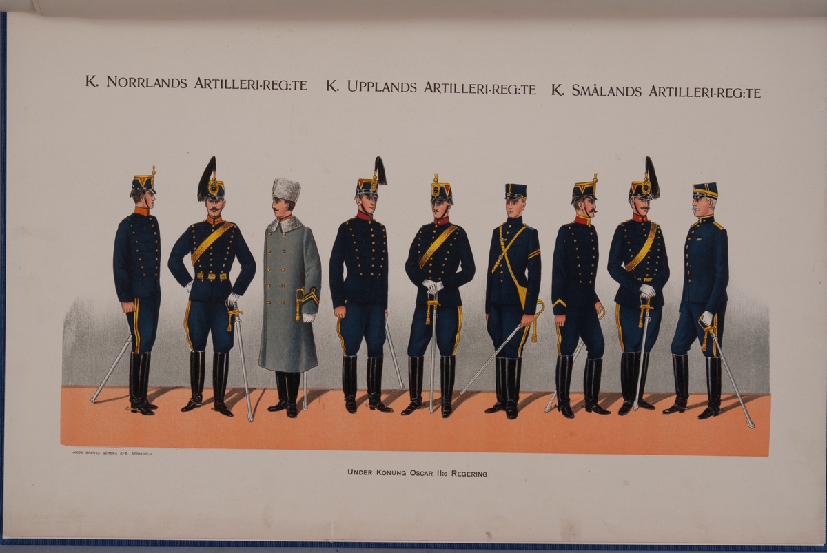 Plansch med uniform för Norrlands artilleriregemente, Upplands artilleriregemente och Smålands artilleriregemente under Oscar II regering. Ingår i boken Svenska krigsmakten under konungarna Carl XIV Johan, Oscar I, Karl XV, Oscar II, utgiven av P.B. Eklund.