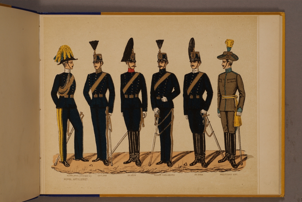 Plansch i färgtryck med uniform för Artilleriregementen. Ingår i planschsamlingen Svenska arméns och flottans officersmunderingar utgiven av P.B Eklund.