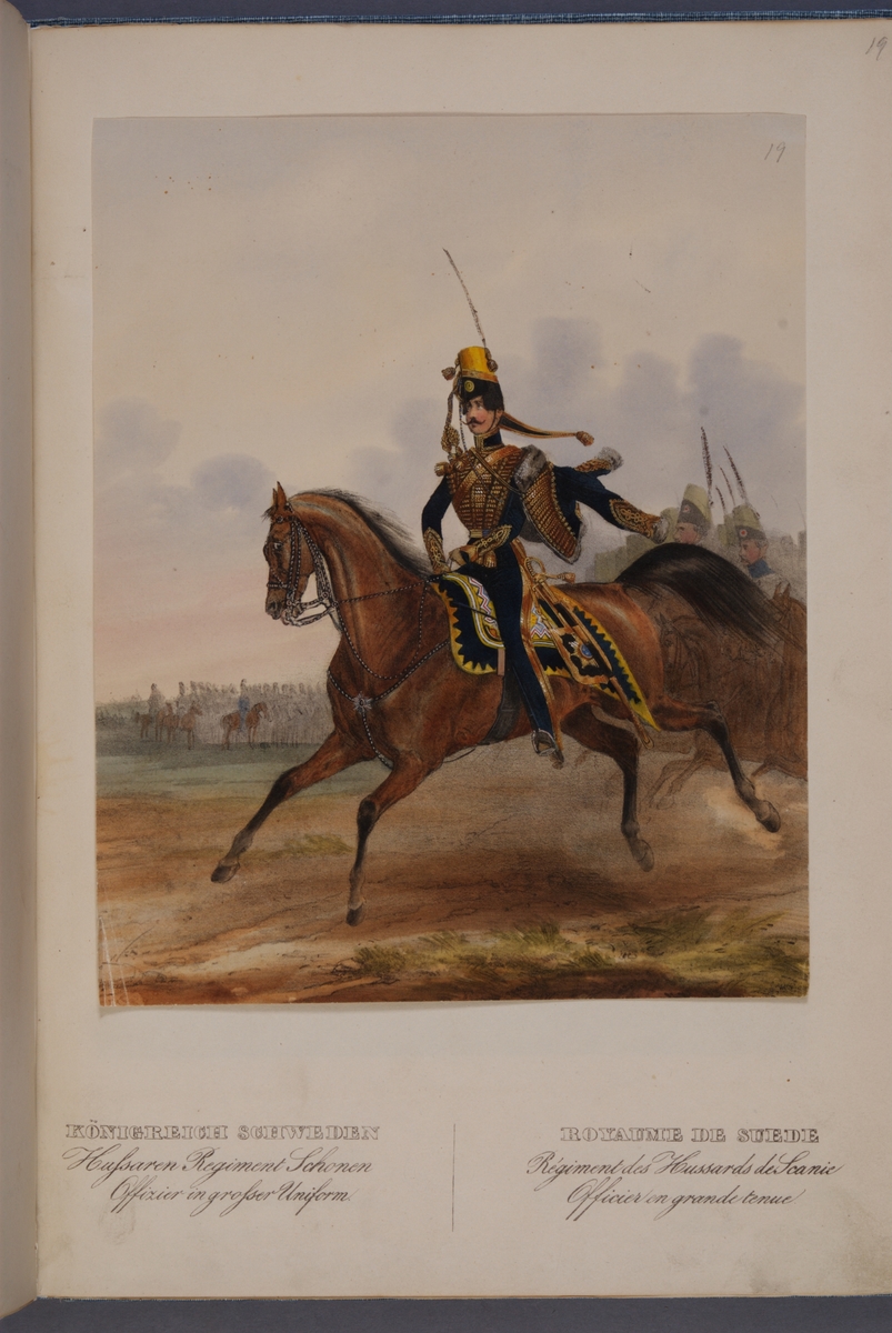 Plansch med paraduniform för officer vid Skånska husarregemente. Ingår i planschsamlingen Das europäische Heer in charakteristischen Gruppen: Scweden, utgiven av Eckert und Monten ca 1840.