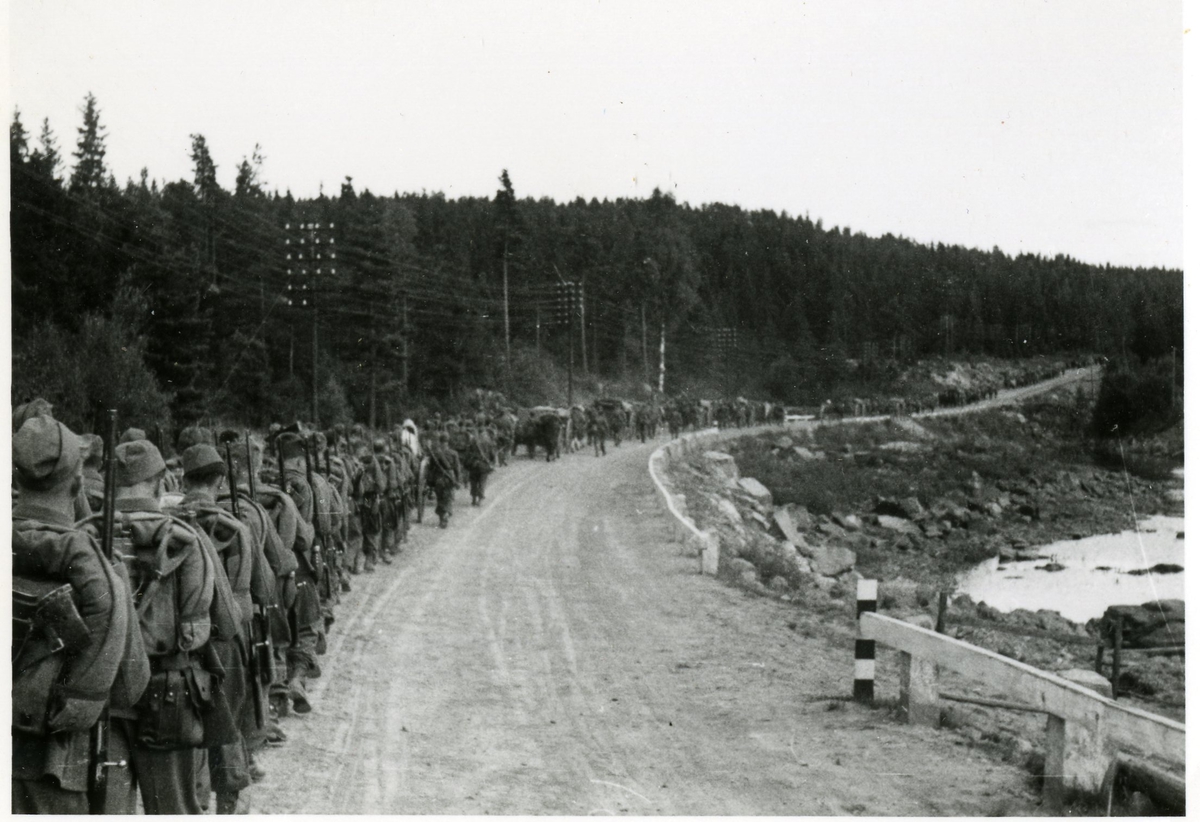 Titel: Soldater marsherar på landsvägen.