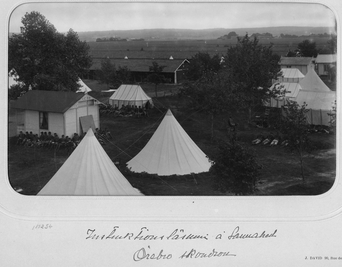 Soldater ur Livregementets husarer K 3, Örebro skvadron, läser instruktioner bland tälten på Sanna hed.