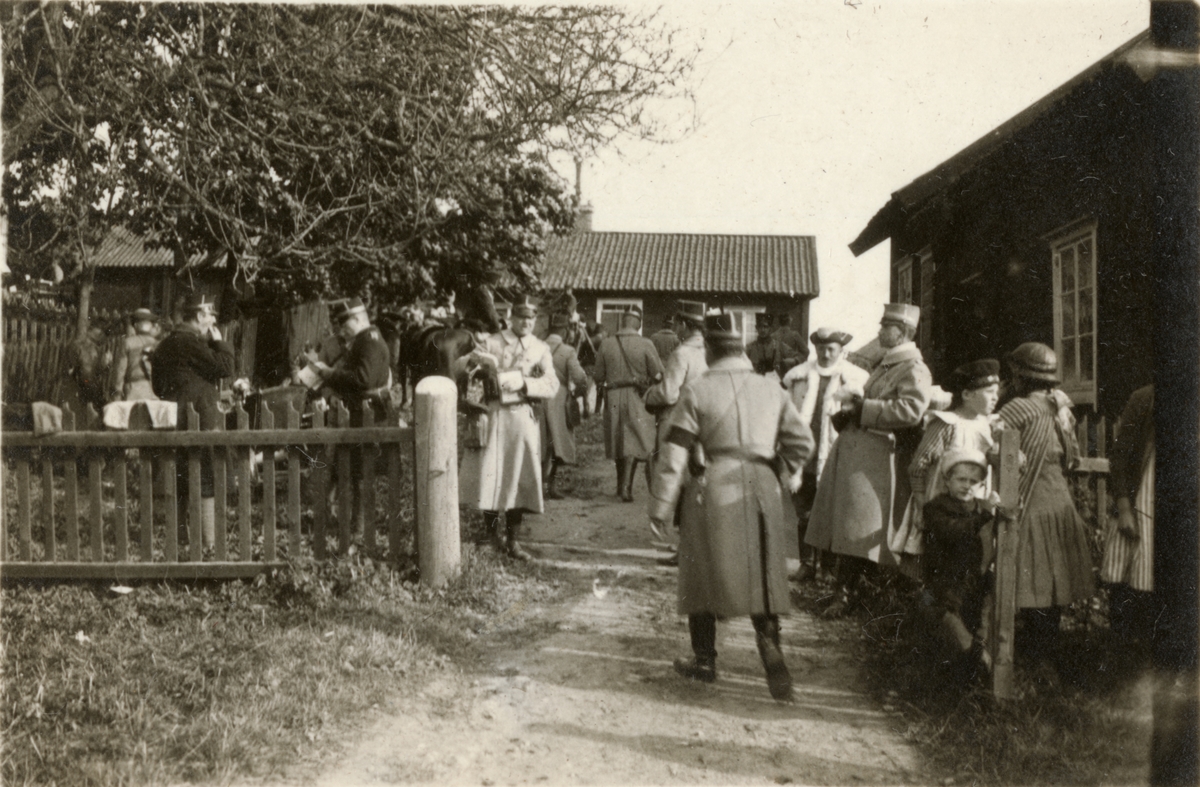 Titel: Samling vid en gård. Fälttjänstövning i Uppland.