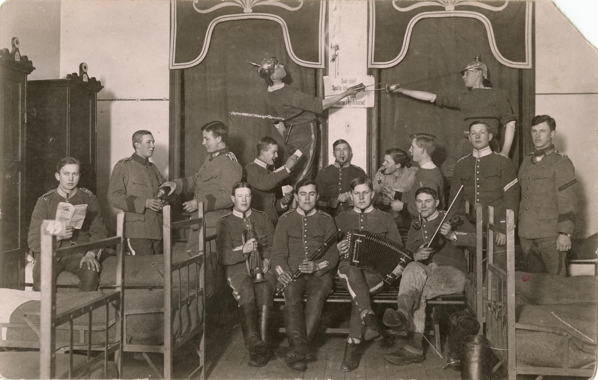 Titel: Gruppbild med soldater från Livgardet till häst K 1 i logementet.