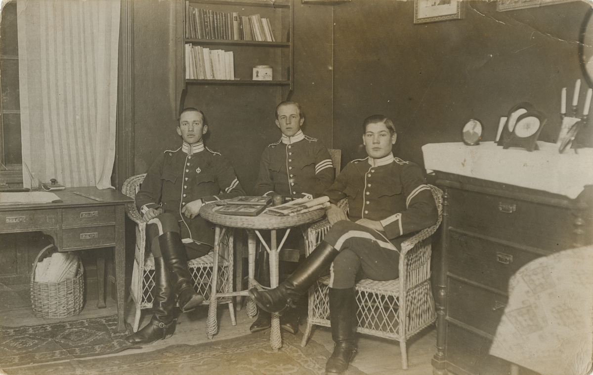 Titel: Tre soldater från Livgardet till häst K 1 i sittande rund ett bord.