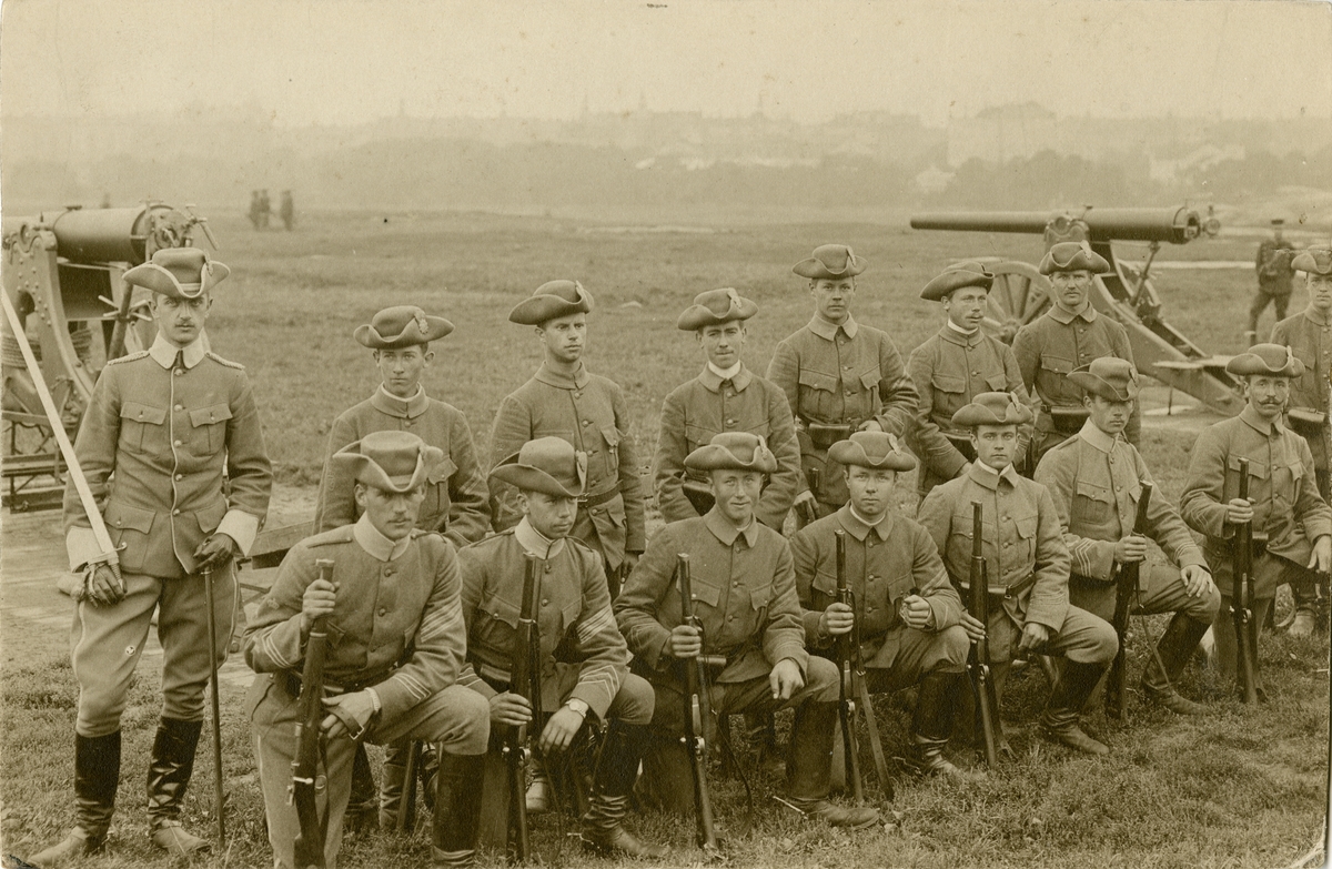 Titel: Grupporträtt av soldater vid Positionsartilleriregementet A 9 på Ladugårdsgärde 1905.