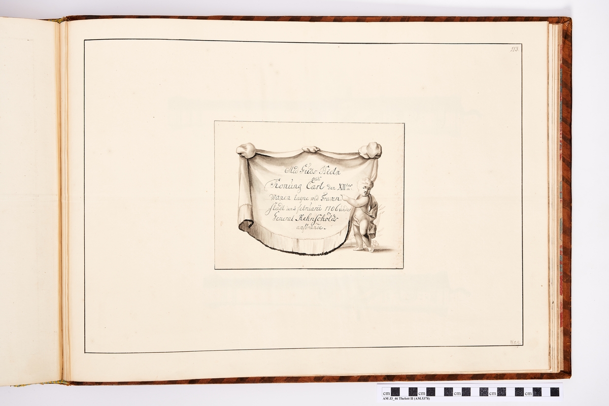 Kartusch till bokverk med avbildningar föreställande eldrör tagna som troféer av den svenska armén åren 1703-1706, utförda av syskonen Anna Maria och Philip Jakob Thelott. Avser troféer tagna vid Fraustadt den 3 februari 1706 under general Rehnskiölds anförande.