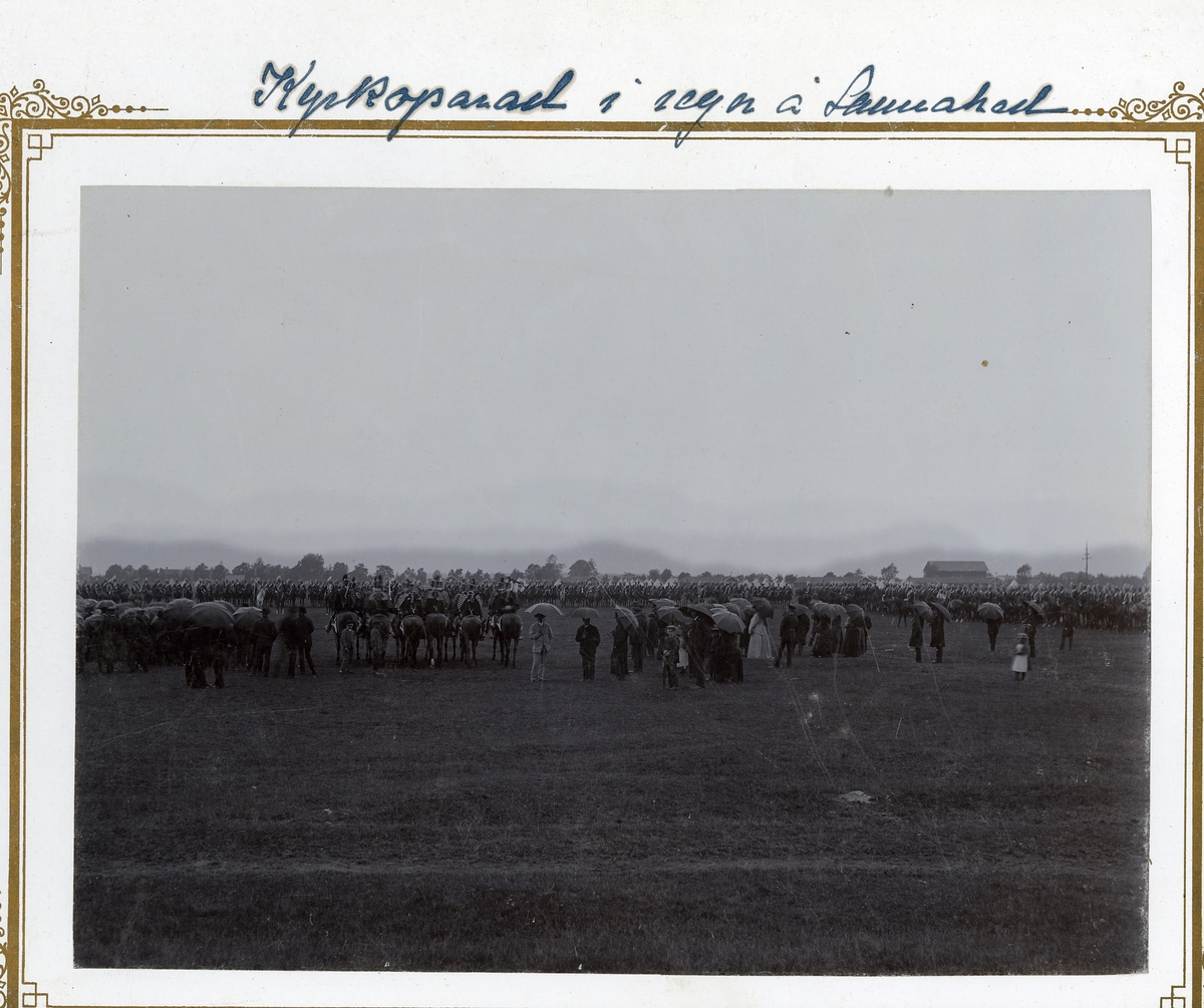 Kyrkparaden på Sanna hed midsommardagen 1892. Livregementets husarer K 3 och civila deltar i firandet.