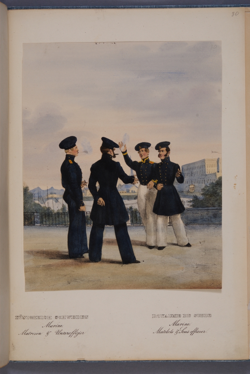 Plansch med uniform för sjöman och underofficer vid Marinen. Ingår i planschsamlingen Das europäische Heer in charakteristischen Gruppen: Scweden, utgiven av Eckert und Monten ca 1840.
