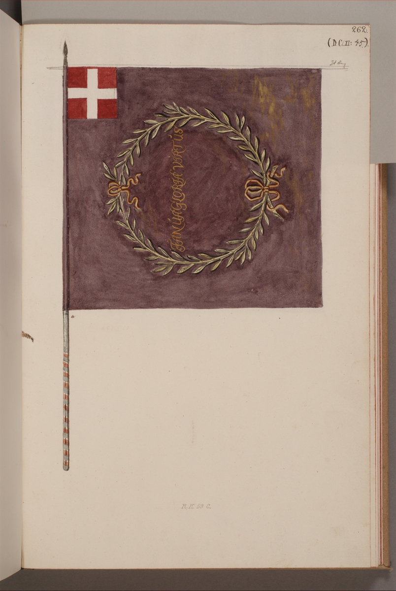 Titel: Avbildning i gouache föreställande fälttecken taget som trofé av svenska armén. Den avbildade fanan finns bevarad i Armémuseums samling, för mer information, se relaterade objekt.