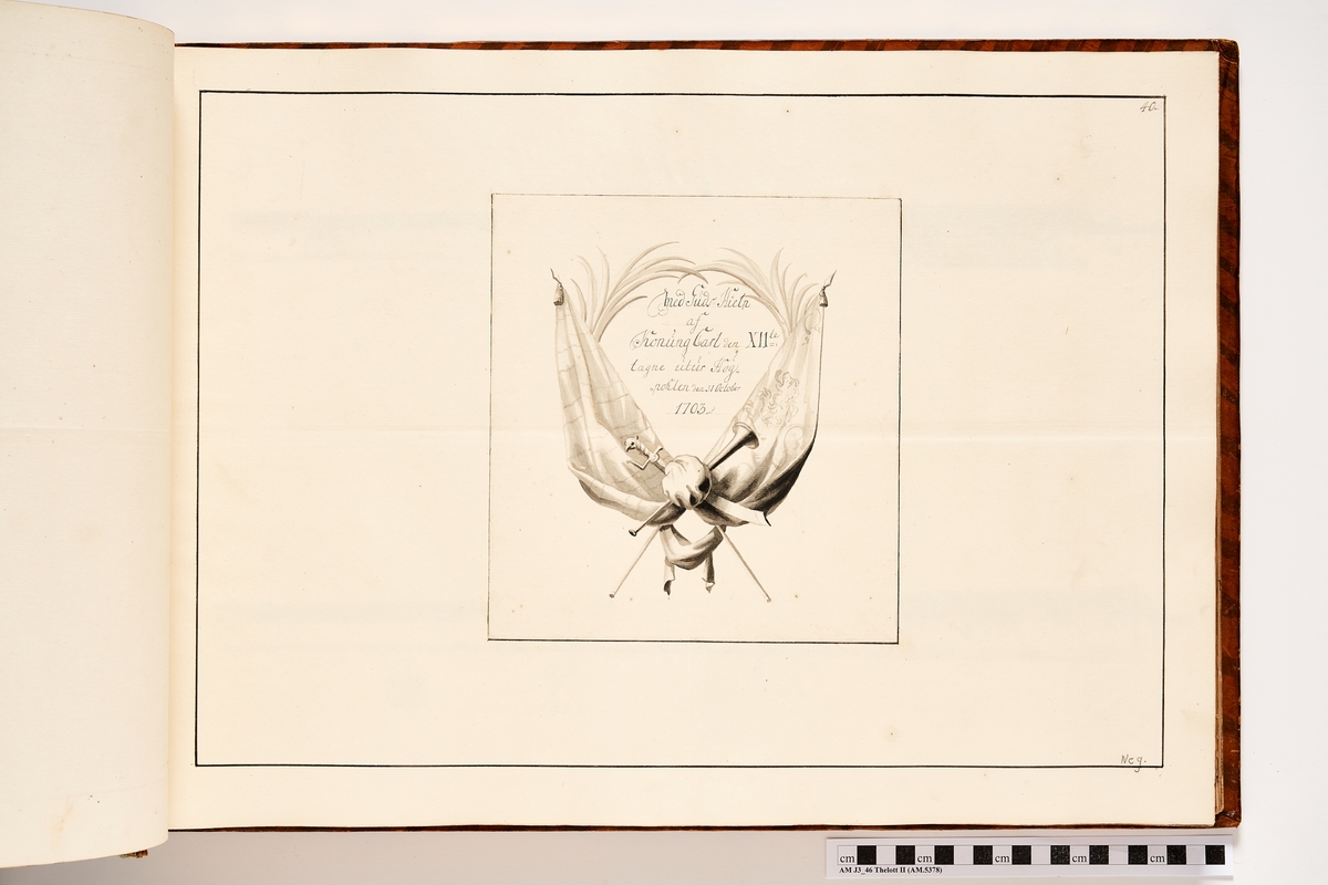 Kartusch till bokverk med avbildningar föreställande eldrör tagna som troféer av den svenska armén åren 1703-1706, utförda av syskonen Anna Maria och Philip Jakob Thelott. Avser troféer tagna utur Högpolen den 31 oktober 1703.