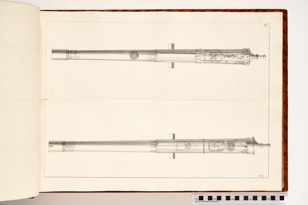 Titel: Avbildning föreställande eldrör tagna som troféer av den svenska armén utur Högpolen den 31 oktober 1703. Ingår i volym med avbildade kanontroféer tagna åren 1703-1706.