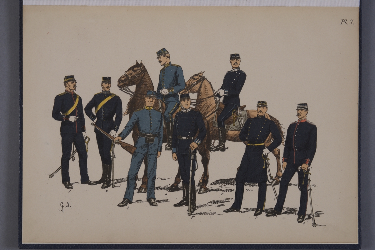 Plansch med uniform för Fortifikationen, Trängen, Auditörstaten, Fältläkarkåren, Intendenturkåren och Veterinärstaten. Ingår i planschsamlingen Svenska armén - 7 planscher i färgtryck, utgiven av Otto Holmgren.