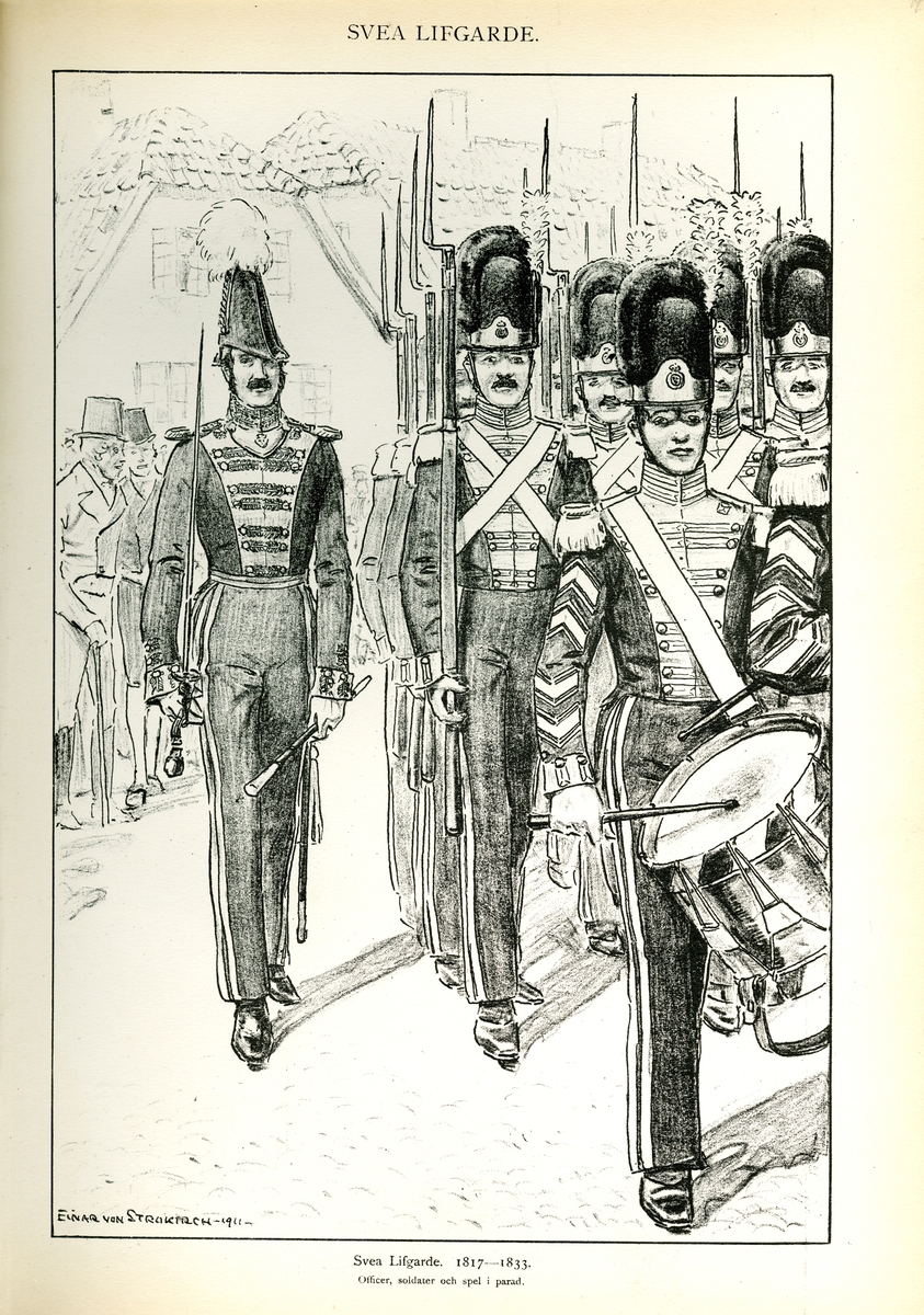 Plansch med uniform för officer, soldater och spel i parad vid Svea livgarde för åren 1817-1833, ritad av Einar von Strokirch. Ingår i planschsamlingen Svenska arméns munderingar 1680-1905.