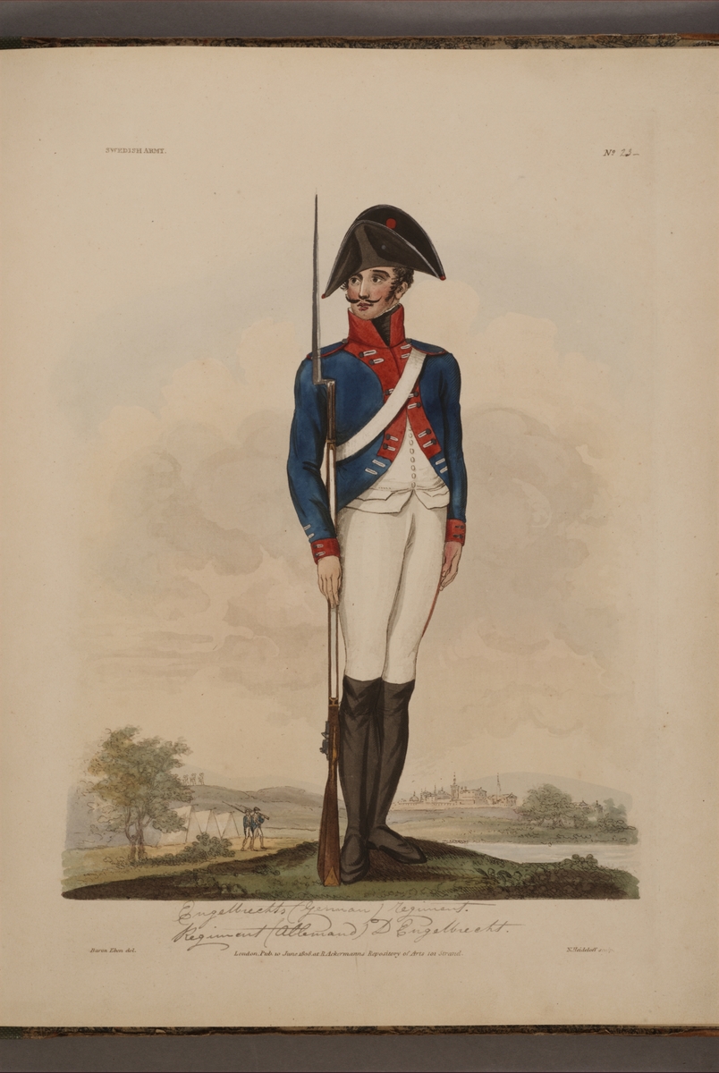 Plansch med uniform för manskap vid Engelbrechts värvade regemente, ritad av Frederic Eben i boken The Swedish Army, utgiven 1808.