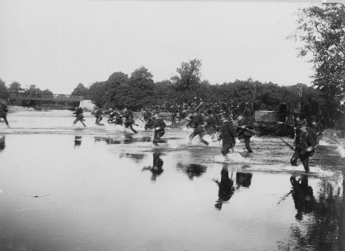 Soldater ur Kronobergs regemente I 11 vadar över Rönneån vid Ljungbyhed. Soldaterna iförda uniform m/1886.