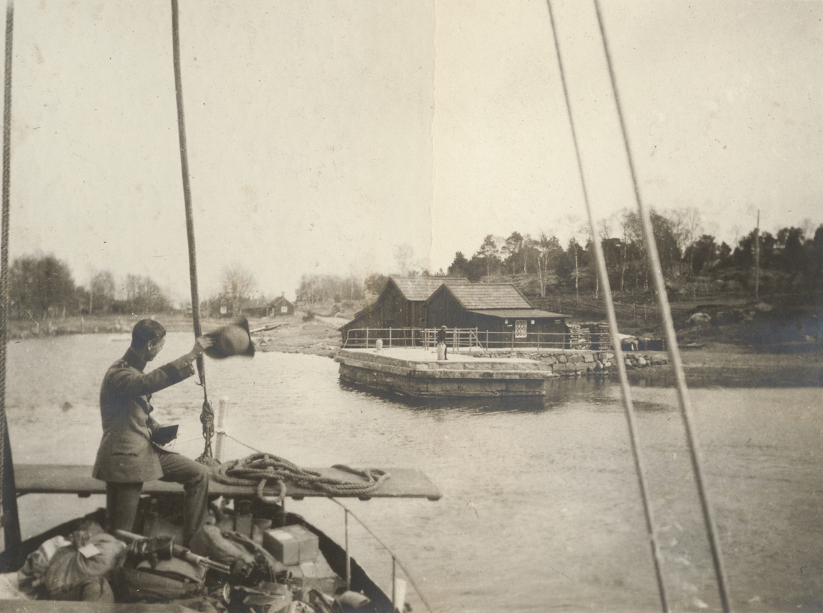 Titel: Båten anländer till hamnen. Soldaten står i fören med landgång i beredskap.