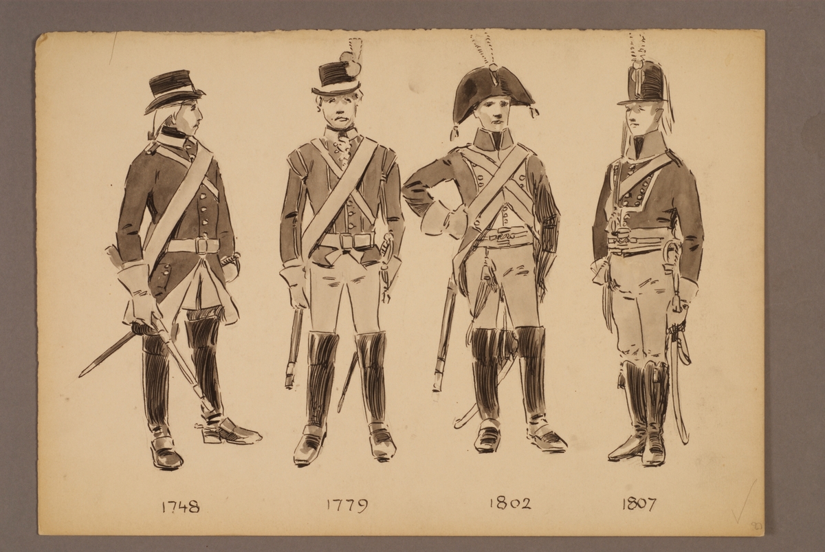 Plansch med uniform för Västgöta regemente för åren 1748-1807, ritad av Einar von Strokirch.