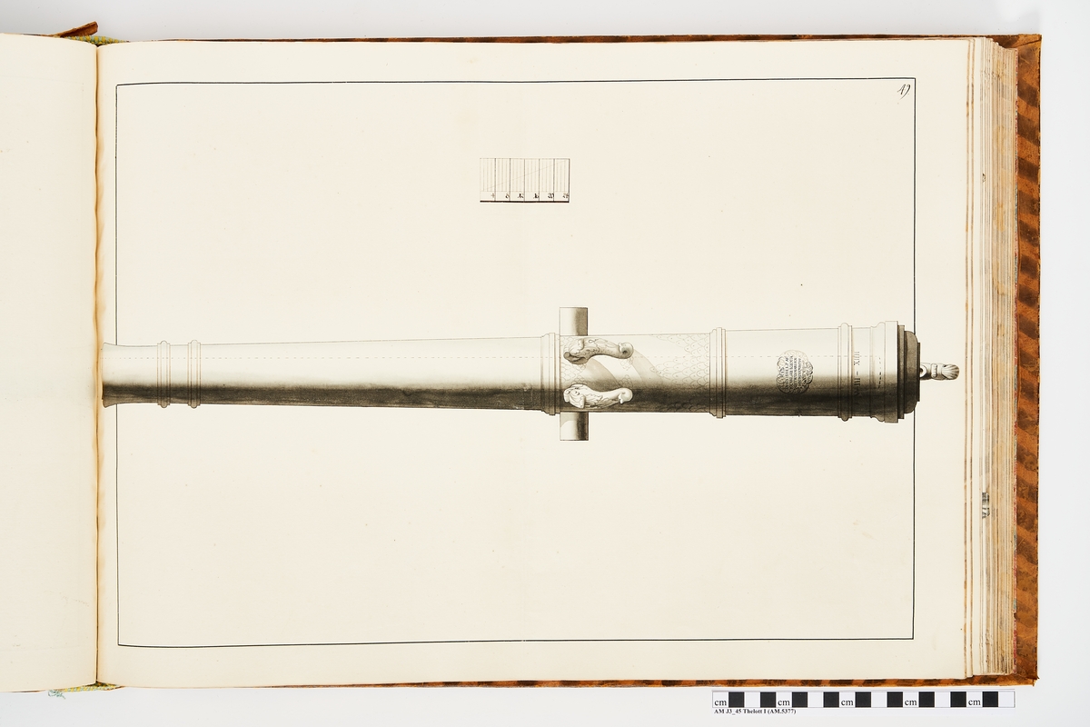 Avbildning föreställande eldrör återtaget som trofé av den svenska armén i slaget vid Narva den 20 november 1700. Ingår i volym med avbildade kanontroféer tagna åren 1700-1702.