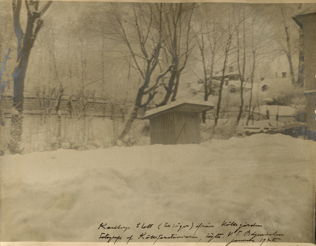 Text i fotoalbum: "Karlbergs Slott (till höger) ifrån Köksgården. Fotografi af Köksföreståndaren, löjt. V. T. Bågenholm, januari 1920".
