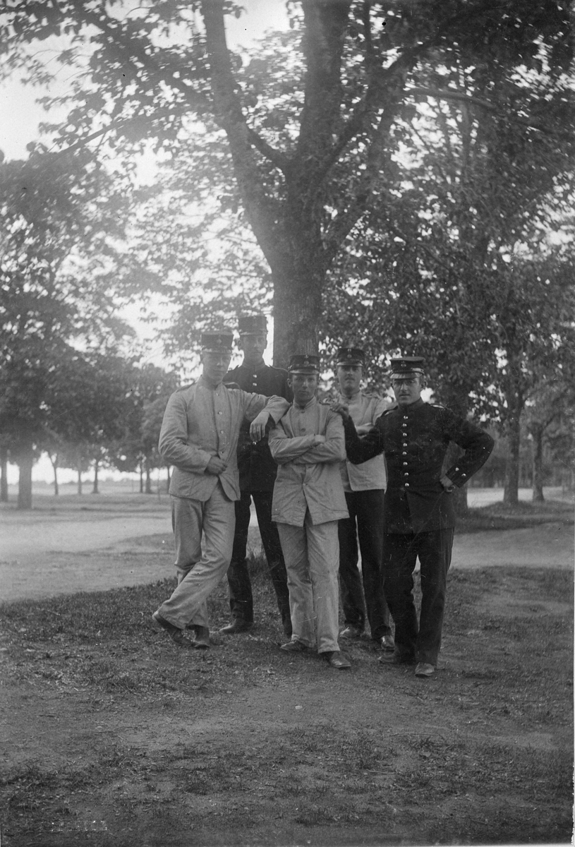 Fem män i uniform m/1886, varav tre i grötrock, stående framför träd, Uppsala 1895.