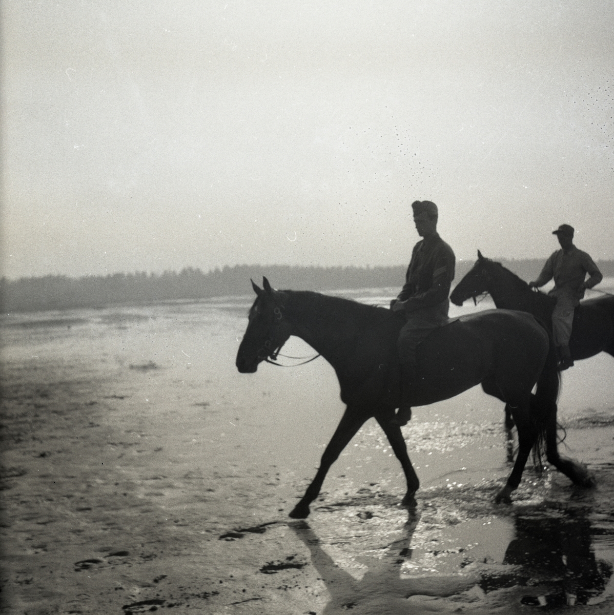 Värnpliktiga rider på stranden. Norrlands dragonregemente K4, Umeå, 1955-1956.
