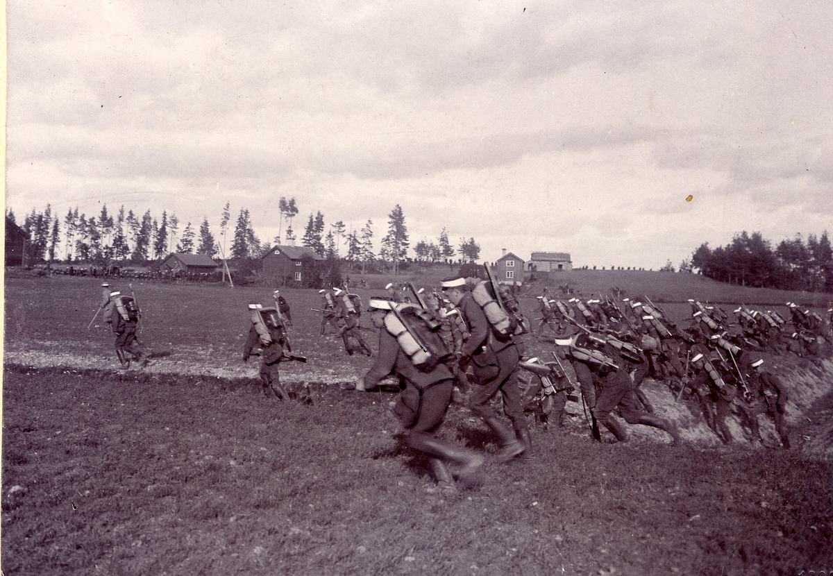 Göta livgarde I 2 stormar över fält med full utrustning under övningsmarsch 1902.