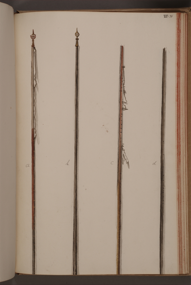 Avbildning i gouache föreställande fanstänger tagna som troféer av svenska armén. De avbildade stängerna finns inte bevarade i Armémuseums samling.
