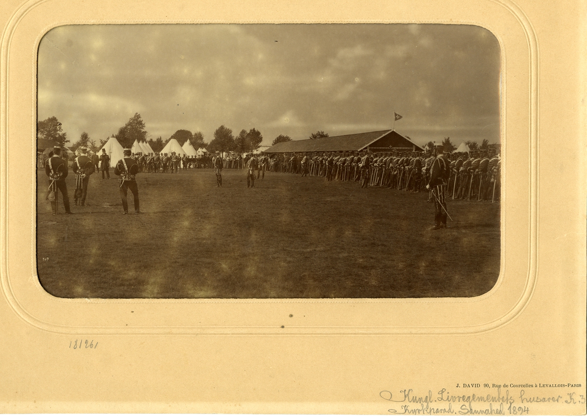Livregementets husarer K 3 uppställda under kyrkparad i Sanna hed år 1894. I bakgrunden finns ett tältläger och civila åskådare.