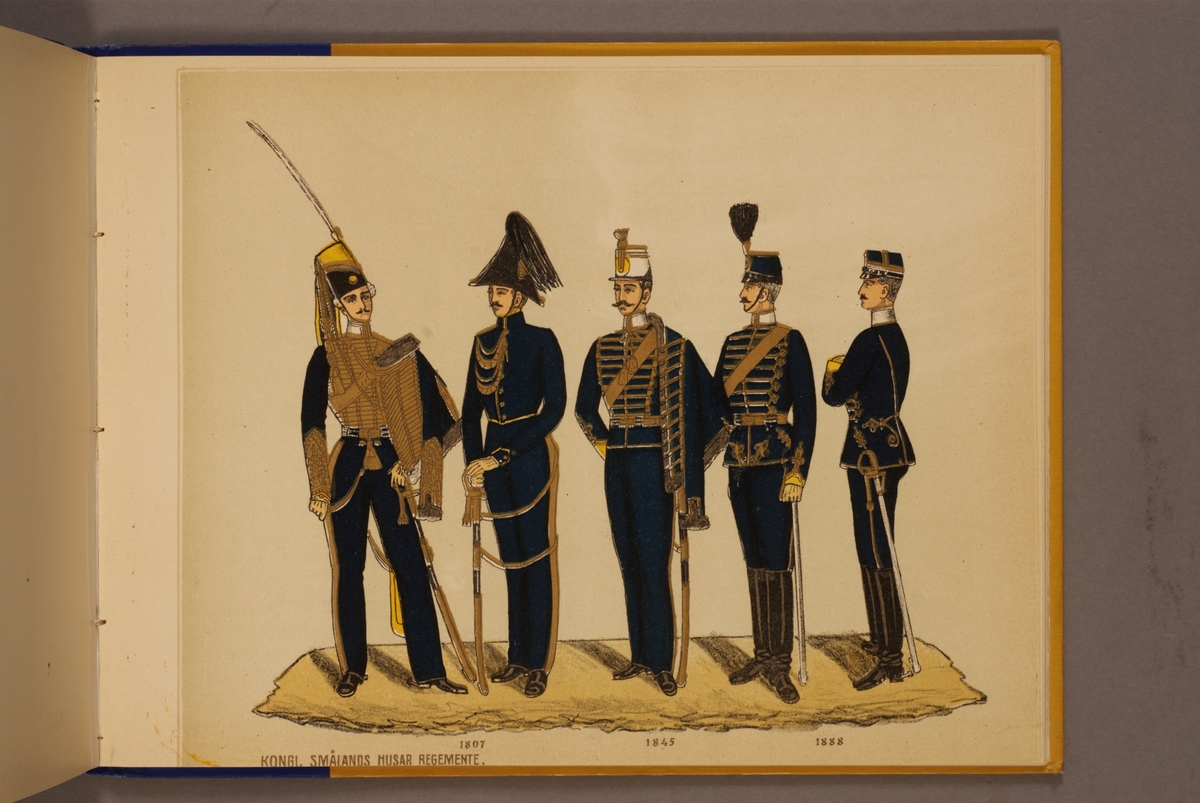 Plansch i färgtryck med uniform för Smålands husarregemente för åren 1807-1888. Ingår i planschsamlingen Svenska arméns och flottans officersmunderingar utgiven av P.B Eklund.