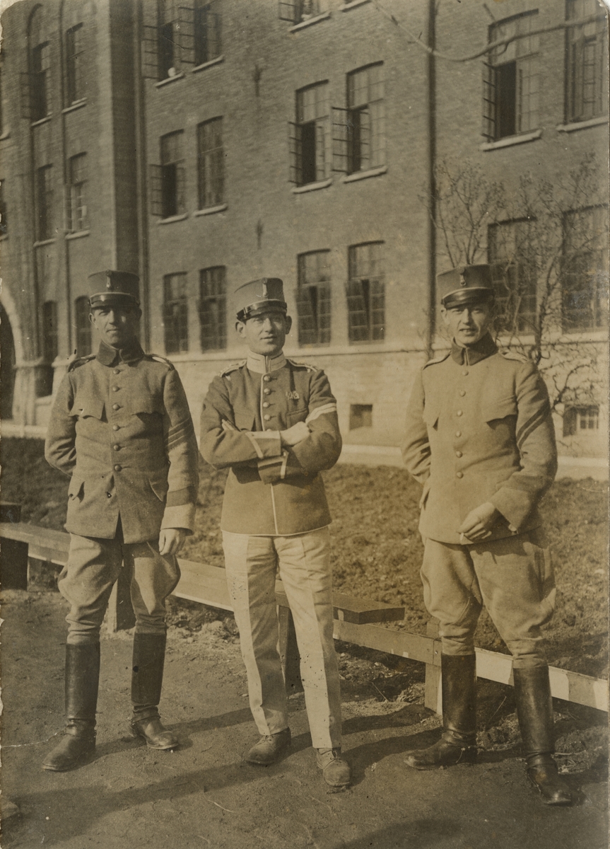 Titel: Tre soldater från Livgardet till häst K 1 uppställda utanför kasernbyggnad.