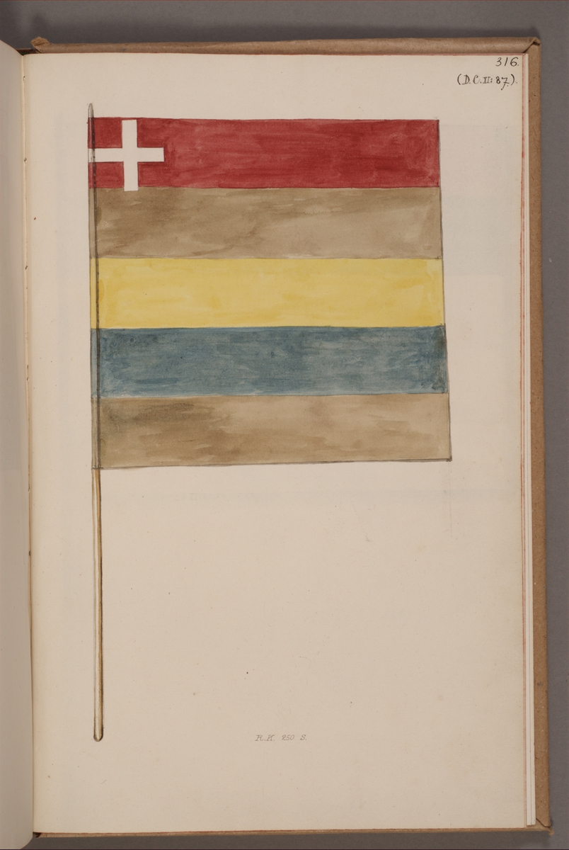 Titel: Avbildning i gouache föreställande fälttecken taget som trofé av svenska armén. Den avbildade fanan finns delvis bevarad i Armémuseums samling, för mer information, se relaterade objekt.