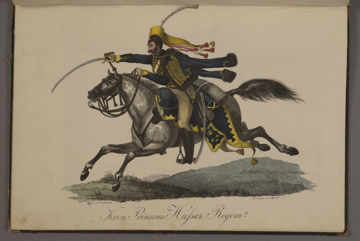 Plansch med uniform för Kronorinsens husarregemente. Plansch i färgtryck efter original av Johan Sjöholm. Ingår i planschsamlingen Kongliga svenska arméens uniformer utgiven som stentryck av Müller 1825.