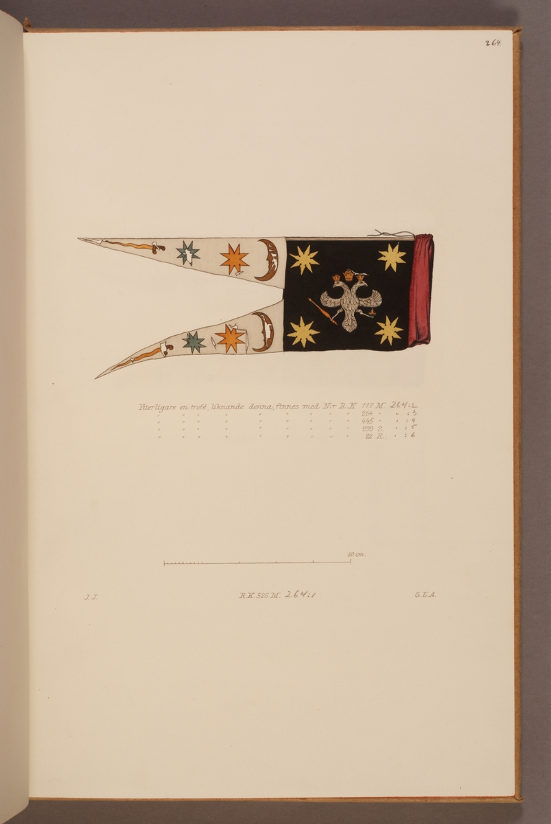 Avbildning i gouache föreställande fälttecken taget som trofé av svenska armén. Den avbildade lansfanan finns bevarad i Armémuseums samling, för mer information, se relaterade objekt.