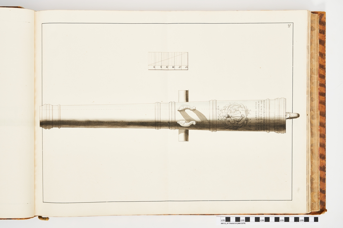 Avbildning föreställande gammalt metallstycke som legat på rikets fästningar, gjuten i Stralsund och med Stralsunds vapen. Ingår i volym med avbildade äldre svenska eldrör förvarade på fästningar samt eldrör erövrade åren 1598-1679.