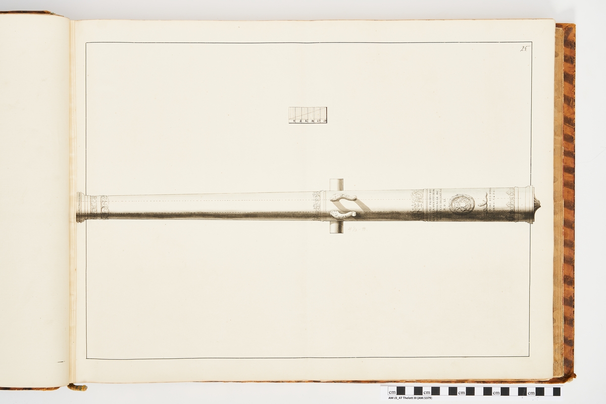 Avbildning föreställande gammalt metallstycke som legat på rikets fästningar, med Phillipus I monogram. Ingår i volym med avbildade äldre svenska eldrör förvarade på fästningar samt eldrör erövrade åren 1598-1679.