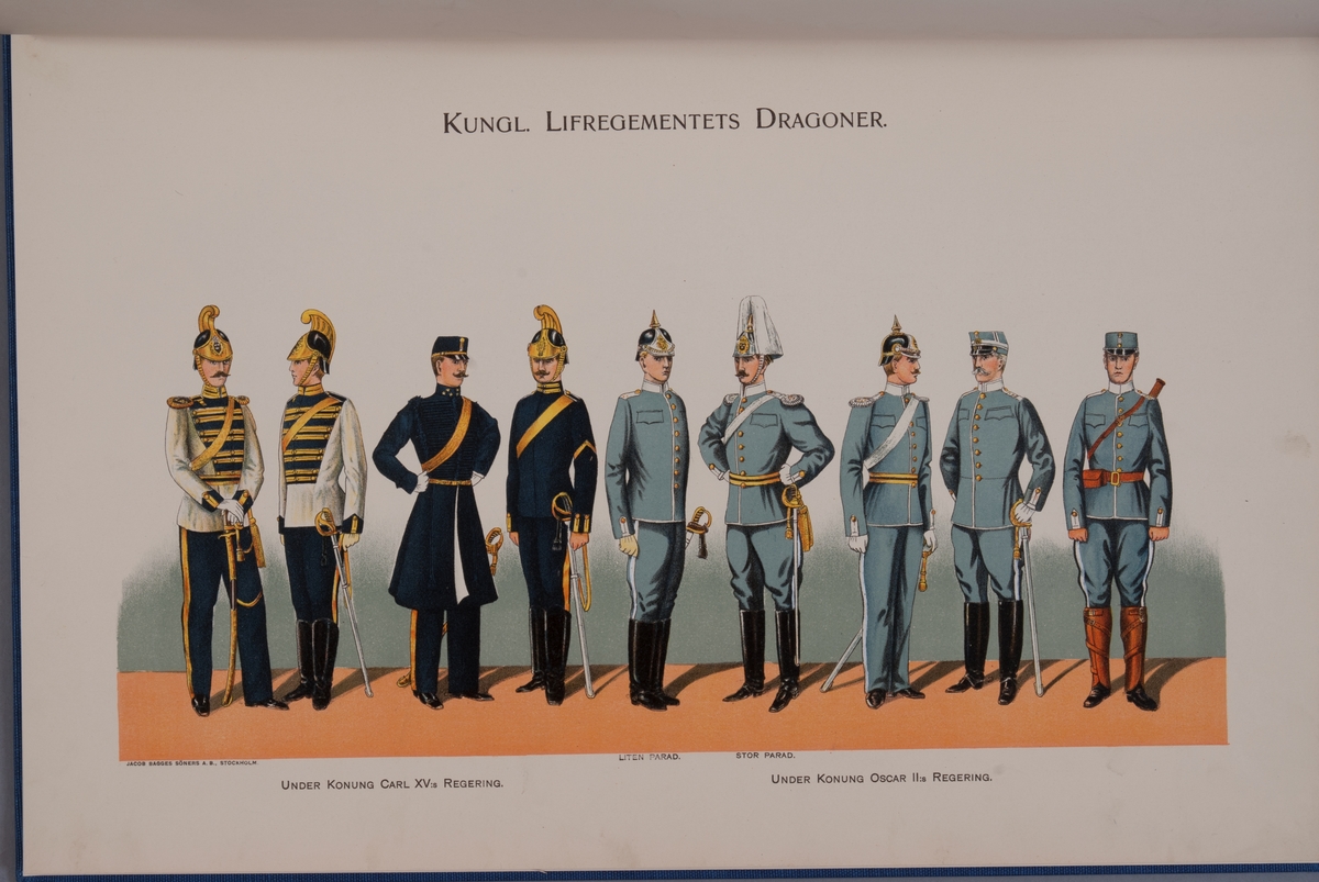 Plansch med uniform för Livregementets dragoner under Karl XV regering och Oscar II regering. Ingår i boken Svenska krigsmakten under konungarna Carl XIV Johan, Oscar I, Karl XV, Oscar II, utgiven av P.B. Eklund.