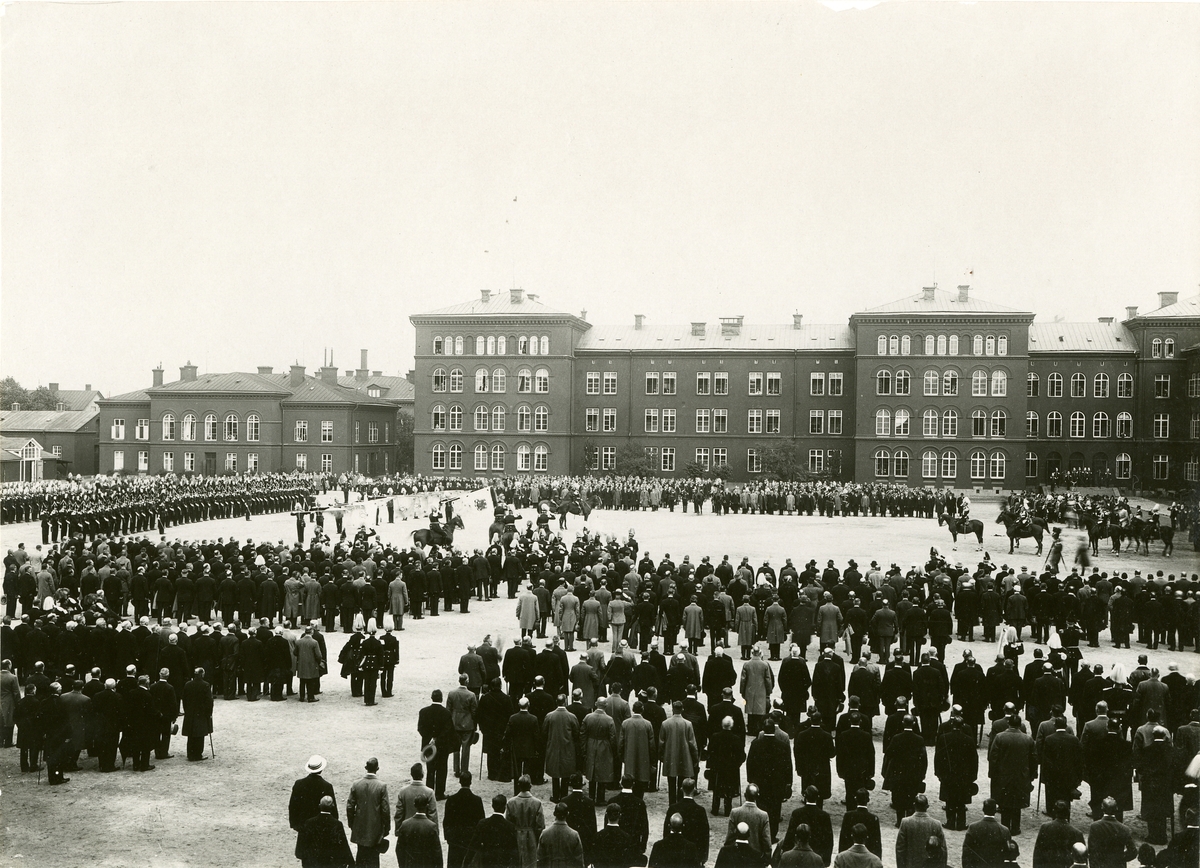 Titel: Uppställning med fanor och musikkår vid firandet av Svea livgardes 400- års jubileum 1921.