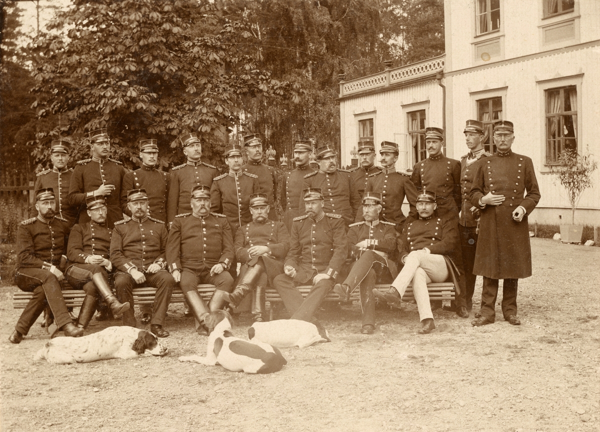 Titel: Grupporträtt famför en byggnad.